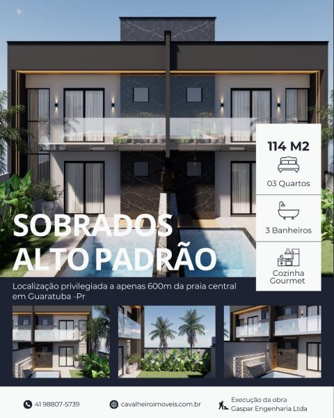Mais um Empreendimento sendo lançado pela Construtora Gaspar Engenharia no Bairro Brejatuba, são Sobrados de 114,00 m2, com entrada de garagem para aproximadamente 3 carros, piscina com cascata e jardim na frente do sobrado, no térreo temos, sala copa e cozinha com área gourmet em um ambiente integrado, banheiro social, lavanderia nos fundos do terreno e no piso superior, 3 quartos sendo um deles suíte com sacada e banheiro social, tudo isso sendo construído a aproximadamente 600 metros da Praia Central de Guaratuba, próximo de Mercado, Padaria, Colégio, Igreja Perpétuo Socorro, e a 05 minutos do Centro de nossa cidade de carro, aproveite a oportunidade, entre em contato com a gente e marque uma visita com um dos nosso corretores. Imagens meramente ilustrativa.